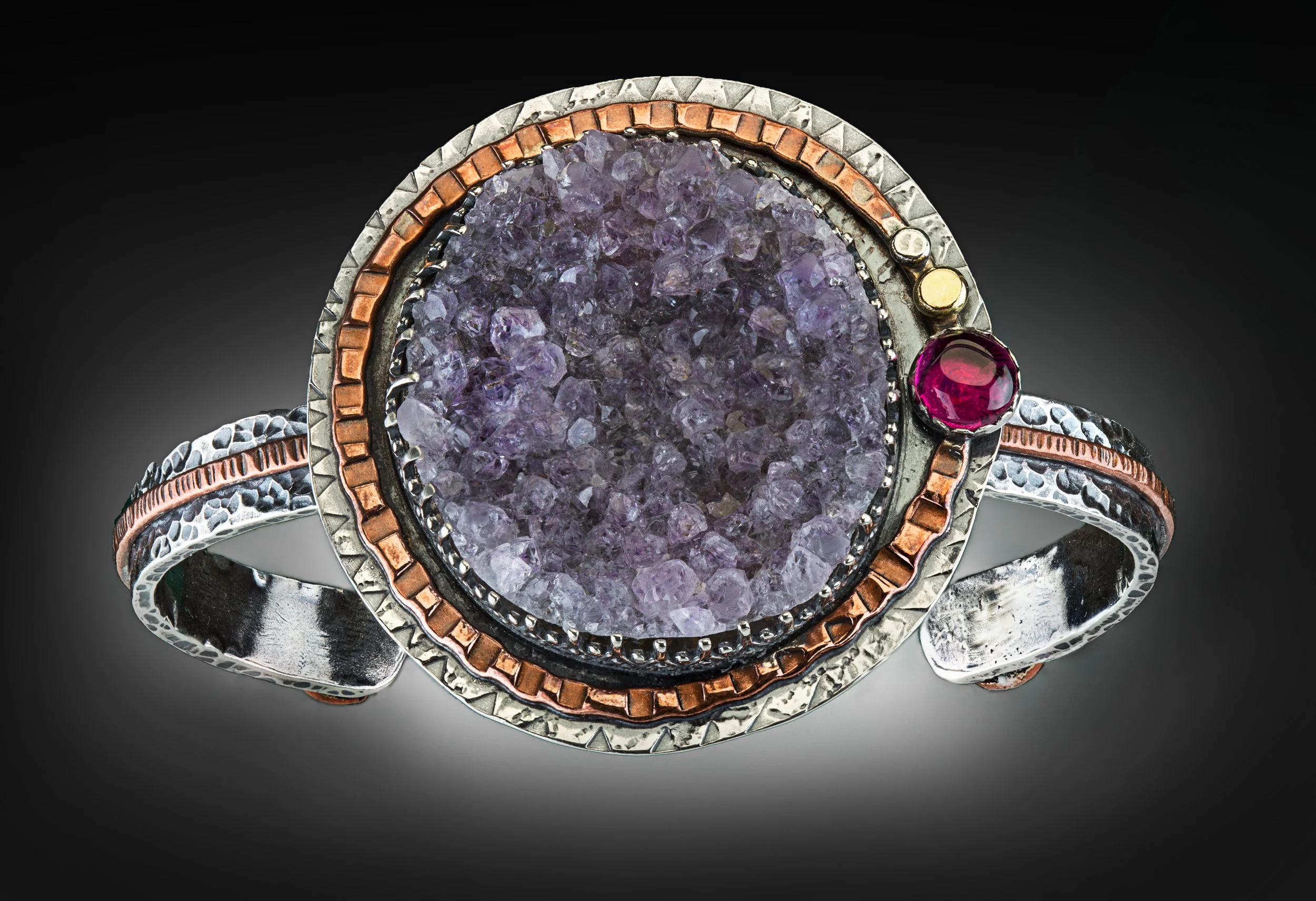 Amethyst Drusy Cuff Bracelet with Ruby accent in sterling silver, 18k gold and copper