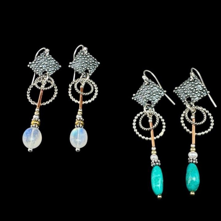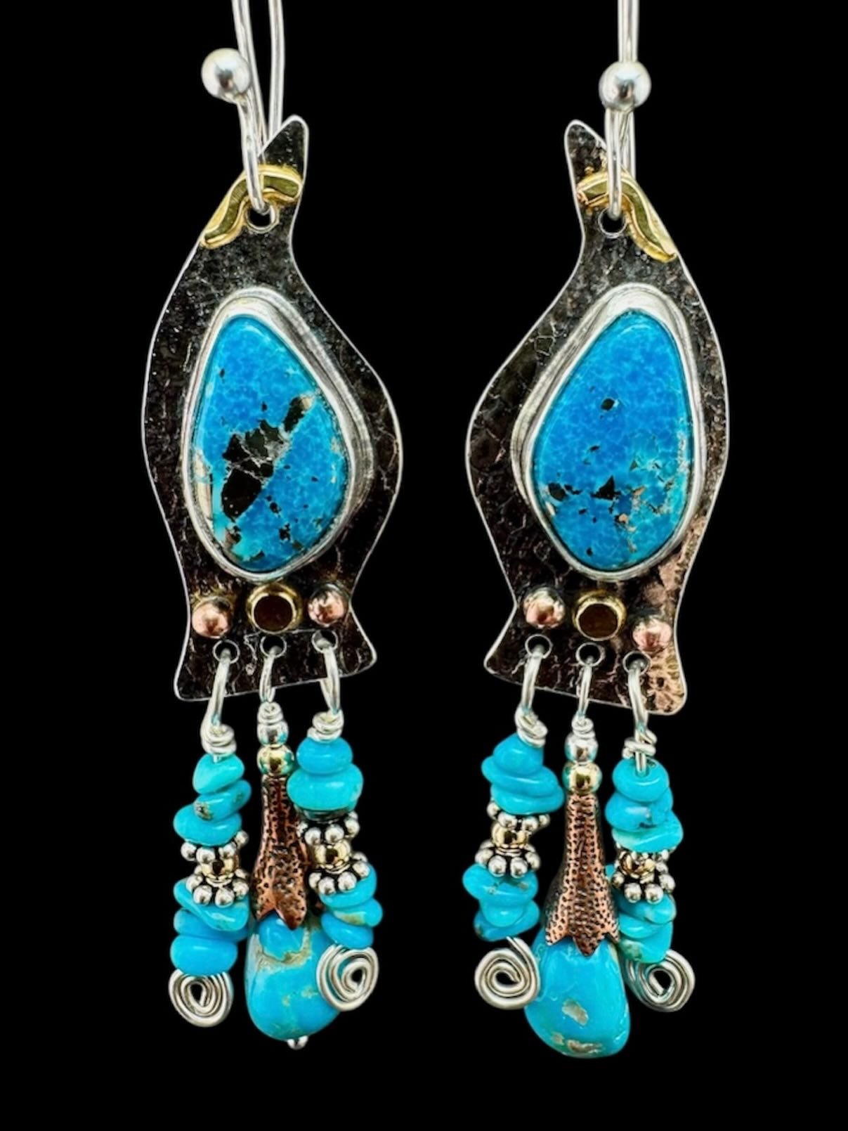One of my most popular earrings in turquoise. These sterling , copper and 14k gold fill beauties have great little blue/green stones that will vary in color and most will have rusty brown matrix. They also feature my hand carved designer sterling silver beads. They measure 1.75" by .25 and feature a lovely lever back for safety and beauty!